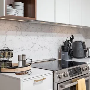 Along with coffee/tea making machines, self-catering facilities in a fully-fitted kitchen include a refrigerator, an oven, and kitchenware.
